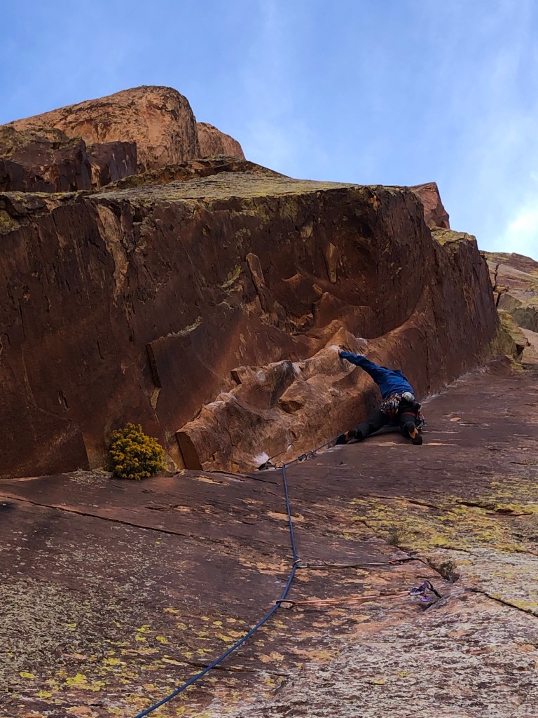 And then there was the crux pitch. The guidebook gives it 11+ whereas Mountain Project gives it 12a. You climb off a nice bolted anchor to make a few slab moves to a slanting crack. Then there’s another slab move or two into a right-facing tips lieback corner. Hard. I haven’t climbed enough hard sandstone liebacky cracks like this one to be able to ascertain whether it was an 11+ or a 12-. You’ll have to climb it and let me know. But damn, that was a gorgeous stretch of really challenging climbing. Grateful to Will for getting me up it.