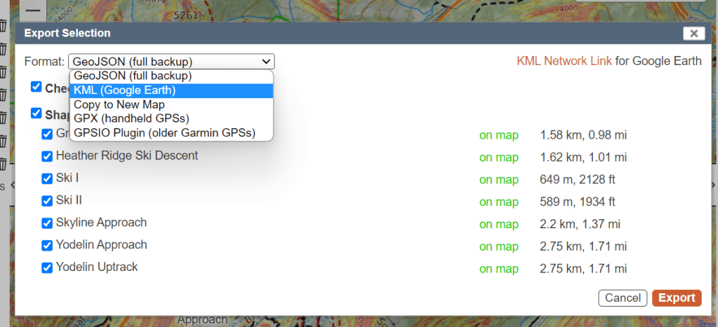 Once we have GPX tracks, we can export them to KML files to get a more 3D model in Google Earth. I use CalTopo, so I’m going to show you how to export from CalTopo to Google Earth using a desktop computer. Follow along with this screenshot guide: